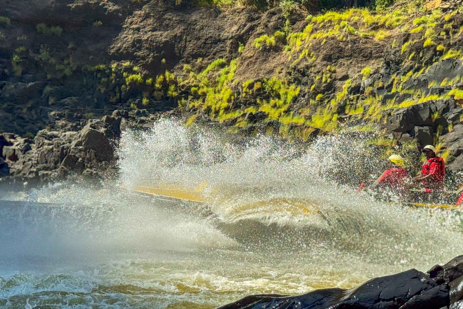 Spænd derefter sikkerhedsselen til en spændende tur i jetbåd gennem strømfaldene, hvor du kommer helt tæt på de majestætiske Victoria Falls, mens du sejler langs vandkanten.