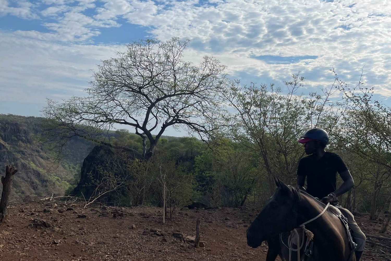Begin your journey at the tranquil stables and wind through the open communal lands of the Chisuma area, located on the outskirts of Victoria Falls. Over 1 to 1.5 hours, traverse dusty village paths, lush grazing lands, and scenic ridges overlooking the stunning Batoka Gorge, offering breathtaking views of the Zambezi River in the distance.