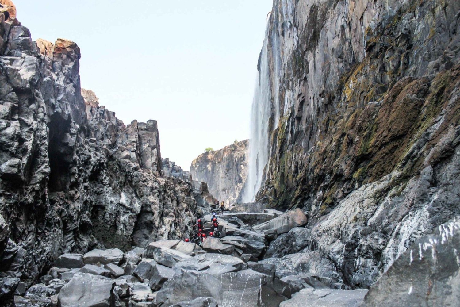 Stap aan boord van een boot om de kalme bovenste kanalen van de Zambezi-rivier over te steken voordat je een wandeltocht naar beneden de kloof in maakt. Ga voorzichtig de natuurlijke rotspoelen onder de watervallen in. Zwem onder de nevel, dobber in het verfrissende water en maak onvergetelijke foto's met regenbogen en de donderende waterval als achtergrond.