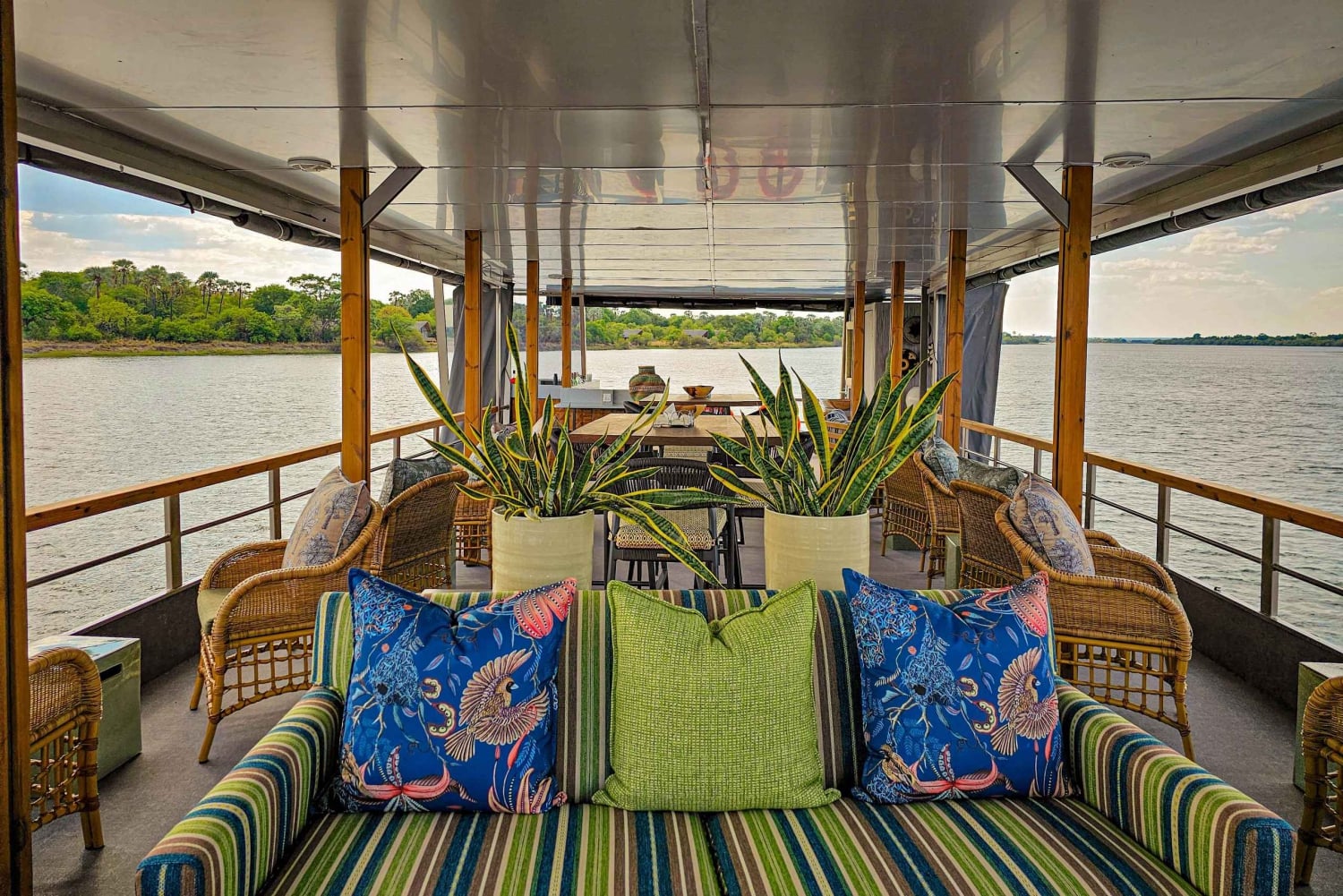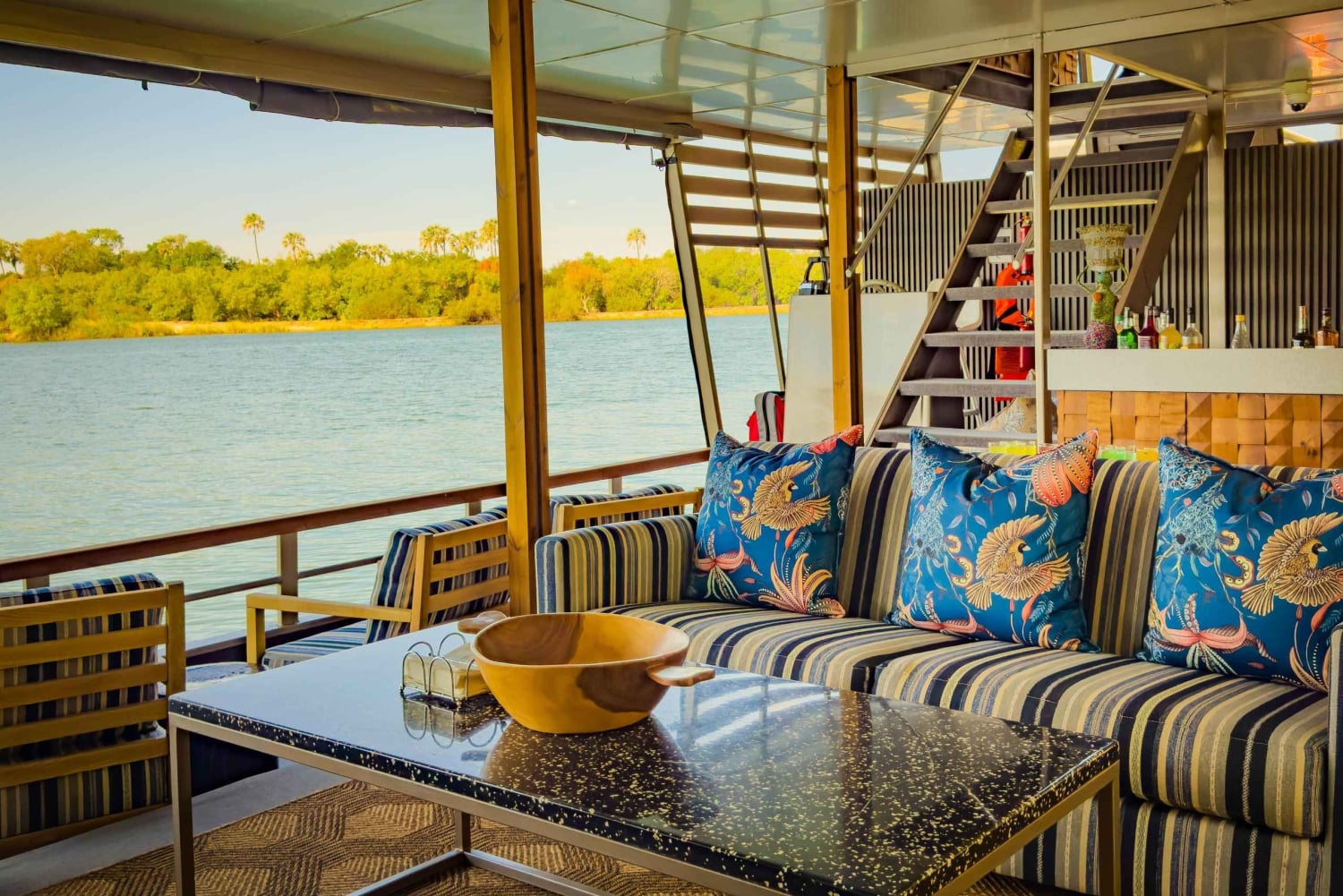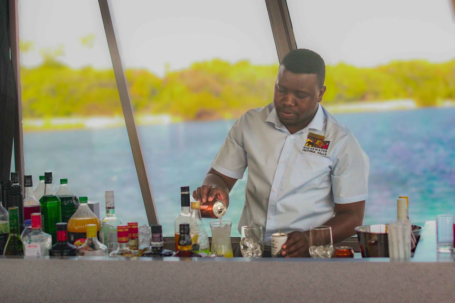 Forestill deg at du ligger henslengt i deilige stoler med en avkjølt cocktail i hånden mens du glir uanstrengt langs Zambezis rolige vann. Den myke brisen, bølgenes skvulp mot båten og de fjerne ropene fra dyrelivet skaper en atmosfære av ren ro.