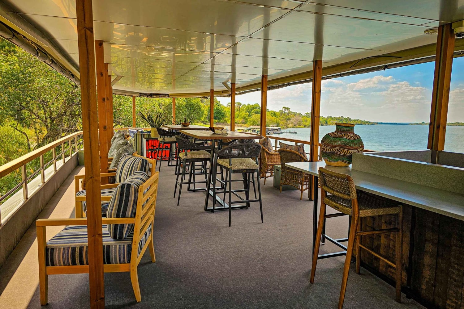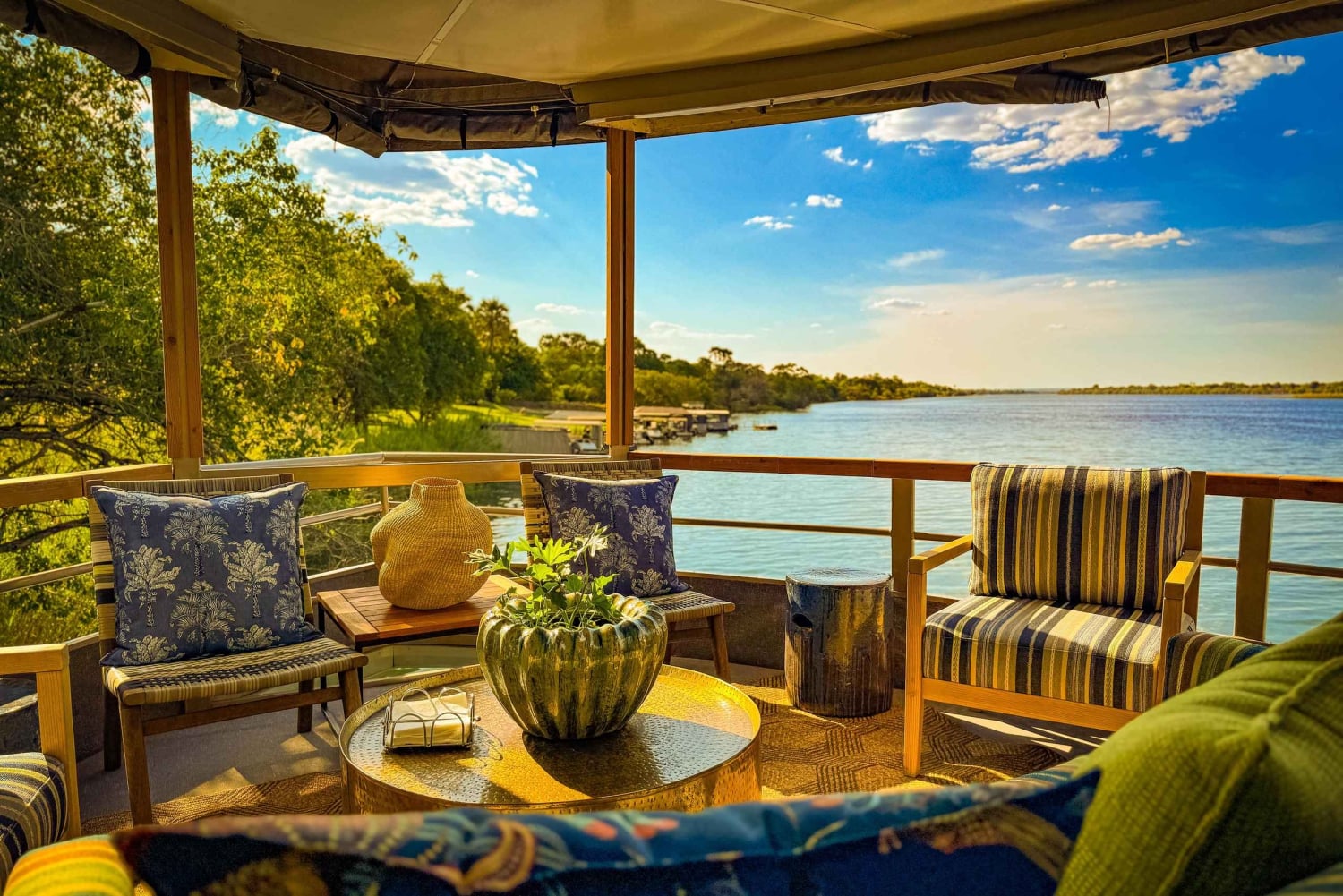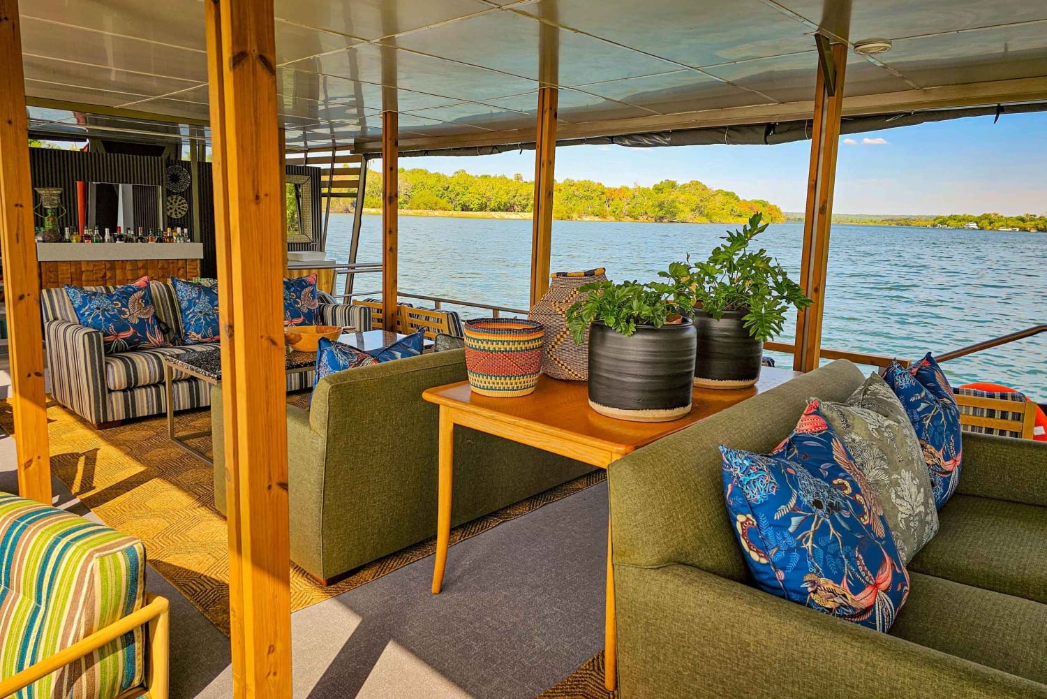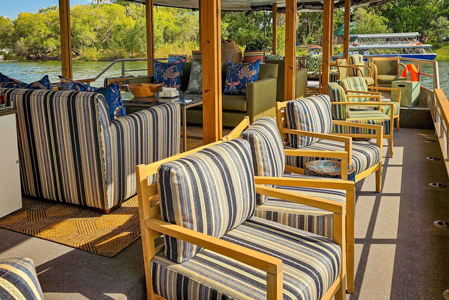 Forestill deg at du ligger henslengt i deilige stoler med en avkjølt cocktail i hånden mens du glir uanstrengt langs Zambezis rolige vann. Den myke brisen, bølgenes skvulp mot båten og de fjerne ropene fra dyrelivet skaper en atmosfære av ren ro.