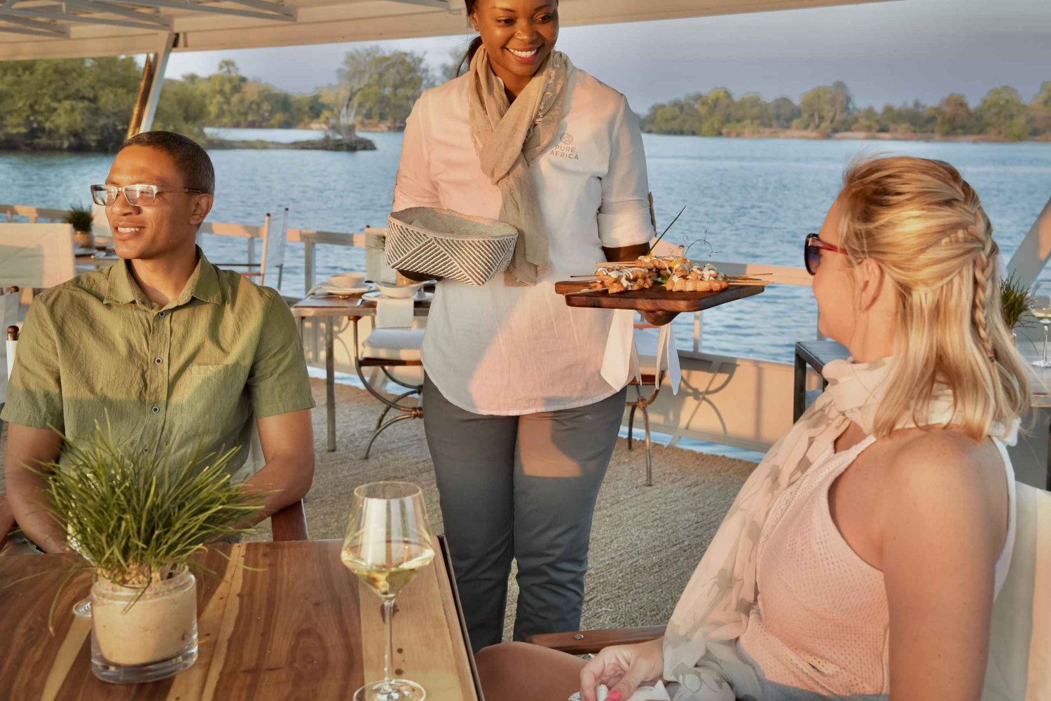 Etter denne berikende kulturelle opplevelsen fortsetter reisen på den mektige Zambezi-elven med et rolig lunsjcruise. Gå om bord i en romslig og komfortabel båt, hvor du blir servert et nylaget måltid mens du glir over en av Afrikas mest ikoniske vannveier. Omgitt av fantastisk natur kan du se flodhester som soler seg i det grunne vannet, krokodiller langs elvebredden og en rekke fugler som svever over deg. Det rolige tempoet på cruiset, kombinert med elvens skjønnhet og smakene av et deilig måltid, skaper en perfekt atmosfære for avslapning.