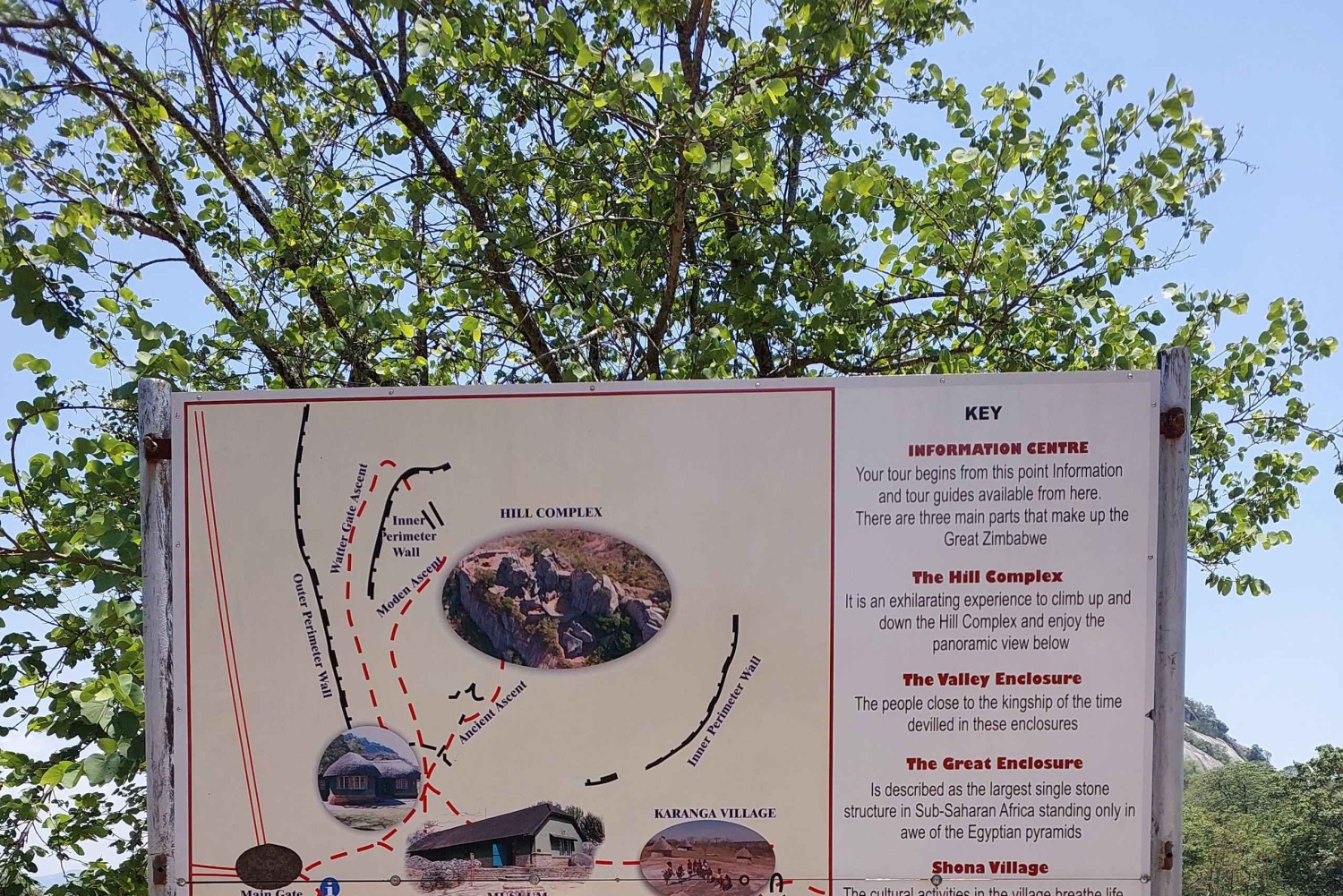 Uwaga: istnieje możliwość noclegu w pobliżu ruin i wyjazdu następnego dnia. (Zakwaterowanie jest dostępne w hotelu Great Zimbabwe Hotel and Lodge w starożytnym mieście).
