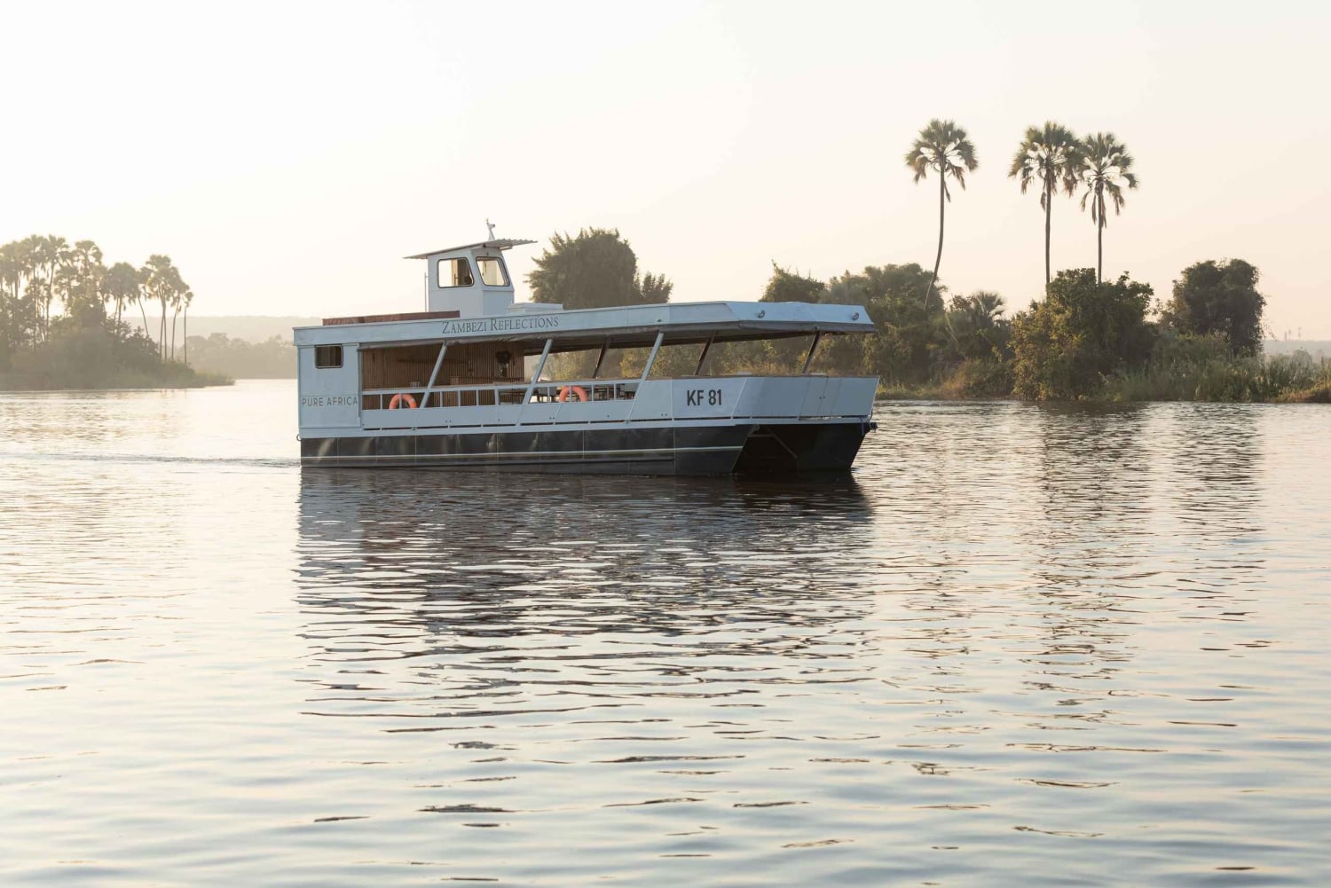 Zrelaksuj się i zjedz pyszny trzydaniowy lunch na idealnie spokojnej rzece Zambezi podczas 2-godzinnego rejsu z pełną obsługą na pokładzie.