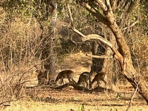 Na manhã seguinte, fomos acordados às 6h com café e biscoitos entregues em nosso quarto e nos preparamos para nos preparar para um safári agendado para as 7h por nossos guias muito competentes Conscious e Zulu. Todos nós entramos nos veículos de safári e vimos uma variedade de vida selvagem e aves, como kudu, impala e mangustos. Após aproximadamente 2 horas, paramos nas margens do Rio Zambezi e desfrutamos de chá e café bem quentes acompanhados de muffins caseiros. Alguns de nosso grupo tentaram pescar nas margens, mas por favor, esteja ciente de que existem crocodilos grandes no rio. Então voltamos ao acampamento e desfrutamos de um brunch completo composto de frutas, iogurte, uma seleção de doces e um café da manhã inglês completo.