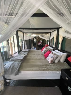 Uma vez que entramos no Parque Nacional Zambezi, tivemos a sorte de ver um grande rebanho de búfalos, assim como elefantes com filhotes. Quando chegamos ao Sian Simba River Lodge, fomos recebidos calorosamente por Janice e sua equipe nos deu uma toalha refrescante cada um, bem como um suco de frutas delicioso. Nossa bagagem foi levada para nossos quartos designados e nos acomodamos para um jantar saboroso composto de sopa de abóbora e risoto de cogumelos seguido de pão com manteiga de chocolate branco, tudo preparado pelo chef Yuan. Nosso quarto era mobiliado com camas grandes, cercadas por redes mosquiteiras com um banheiro privativo composto por chuveiro e vaso sanitário. Eles têm vista para o rio Sian Simba e o acampamento funciona com energia solar, então todos nós desfrutamos de um banho quente antes de irmos para a cama depois de um longo dia.