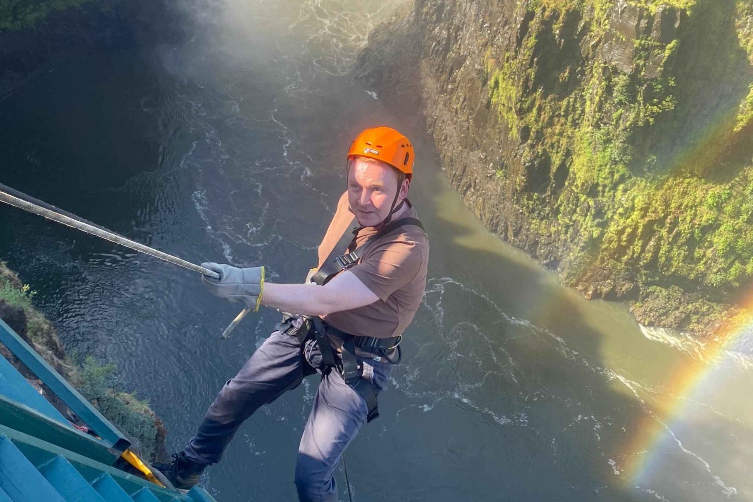 Um passeio panorâmico de rapel com o pano de fundo das Cataratas Vitória, o caldeirão e a famosa Ponte das Cataratas Vitória. O passeio de rapel começa assim que você terminar de mostrar as cataratas.